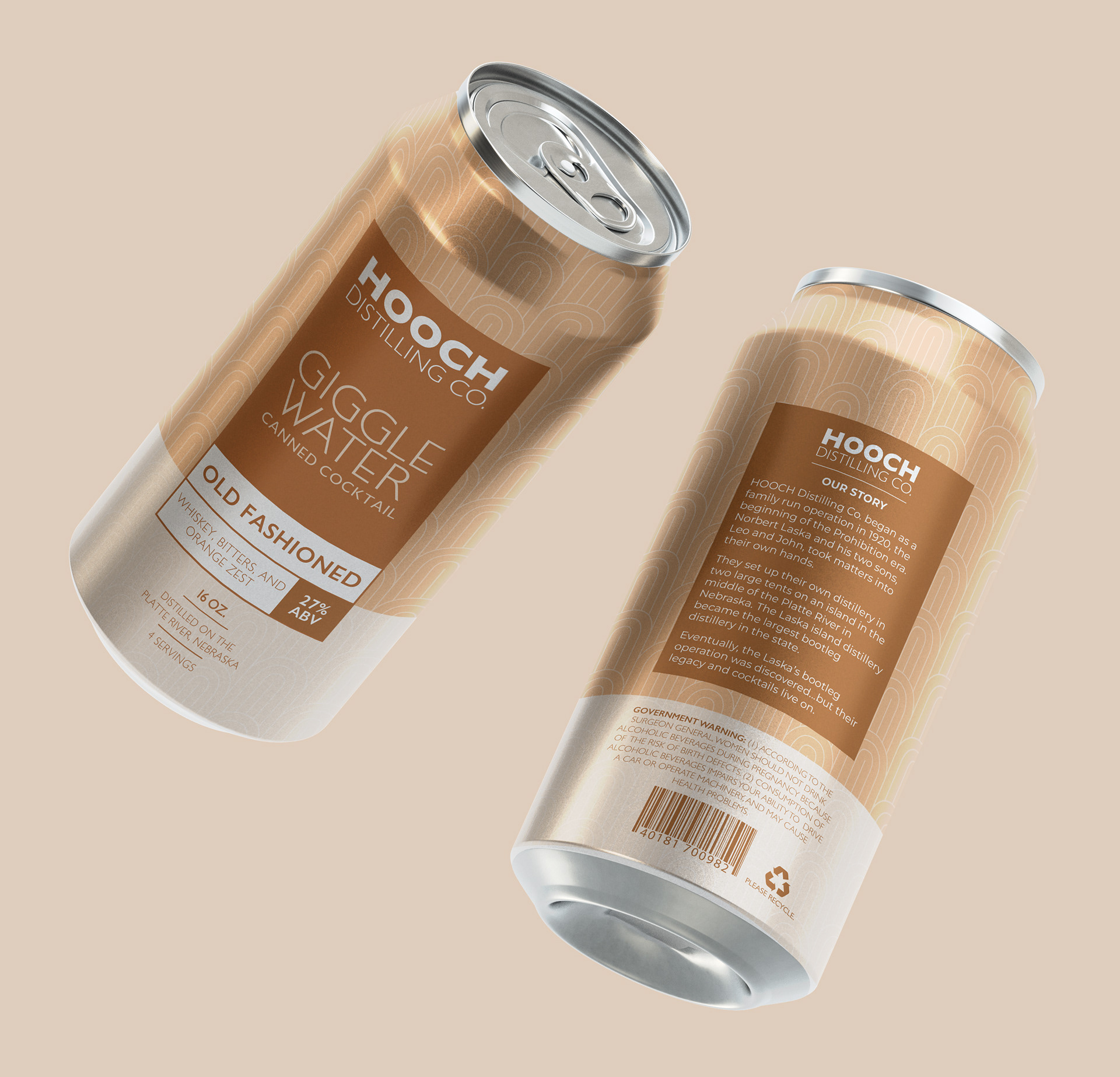 Conceptual package design for Hooch Distilling Co.,inspired by my true family story of bootlegging on an island in the Platte River, Nebraska during the Prohibition era. Hooch is a distilling company that specializes in creating canned cocktails called 'Giggle Water' based on popular prohibition era drinks. To stay true to the prohibition era, the can design and packaging contain an Art Deco inspired pattern with a simple, repetitive pattern. The typography has been adjusted so that the crossbar in the letter 'E' has been dropped to stay true to the typography of the era. Each cocktail has its own monotone color palette in muted tones to give them an old fashioned feel as well as to allow consumers to quickly identify the flavor they're looking for.