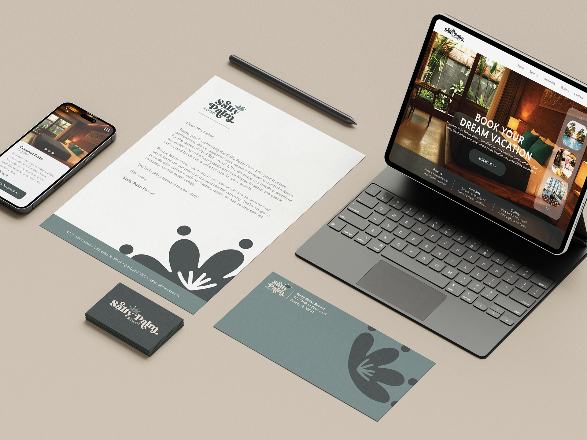 Brand and swag development for a conceptual hotel Salty Palm Resort. The brand development entailed the company name, logo, typography, color palette, pattern, business cards, stationery, website, apparel, drinkware, hotel room key, toiletries, door hanger, slippers, and a beach lounger.